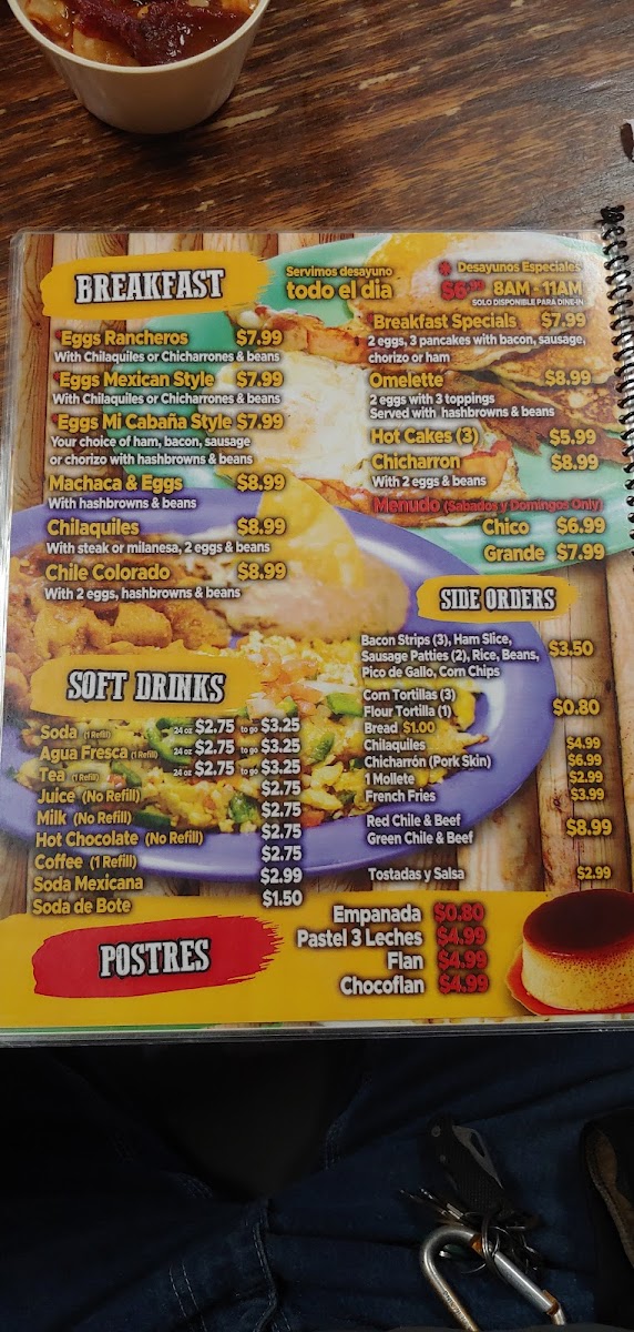 Mi Cabaña in Socorro, TX, offers a vibrant Mexican dining experience featuring hearty, authentic dishes crafted with generous portions. Their breakfast delights include classics like Chile Colorado with eggs and beans, the flavorful Chilaquiles with steak, and the satisfying Machaca & Eggs, each paired with hashbrowns that add a comforting touch. For a lighter start, their three-piece hot cakes are a sweet option.